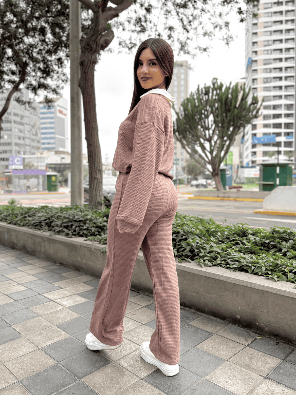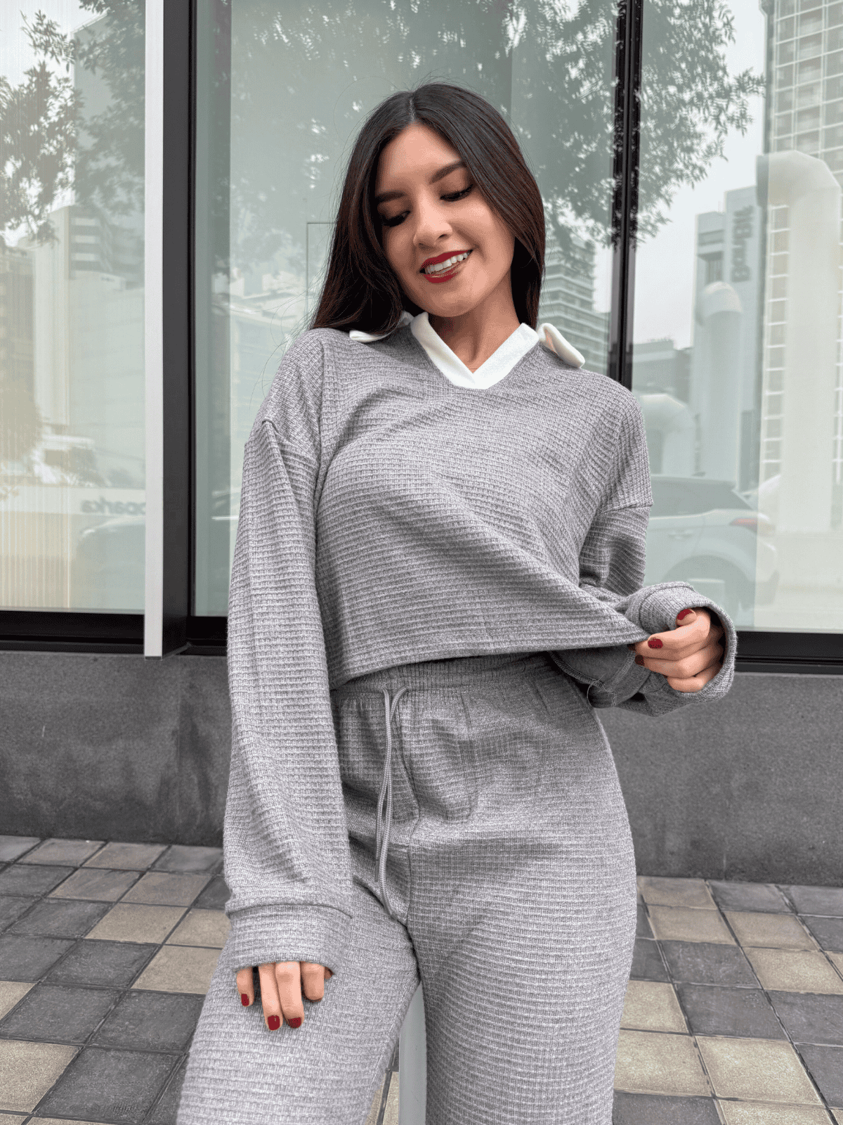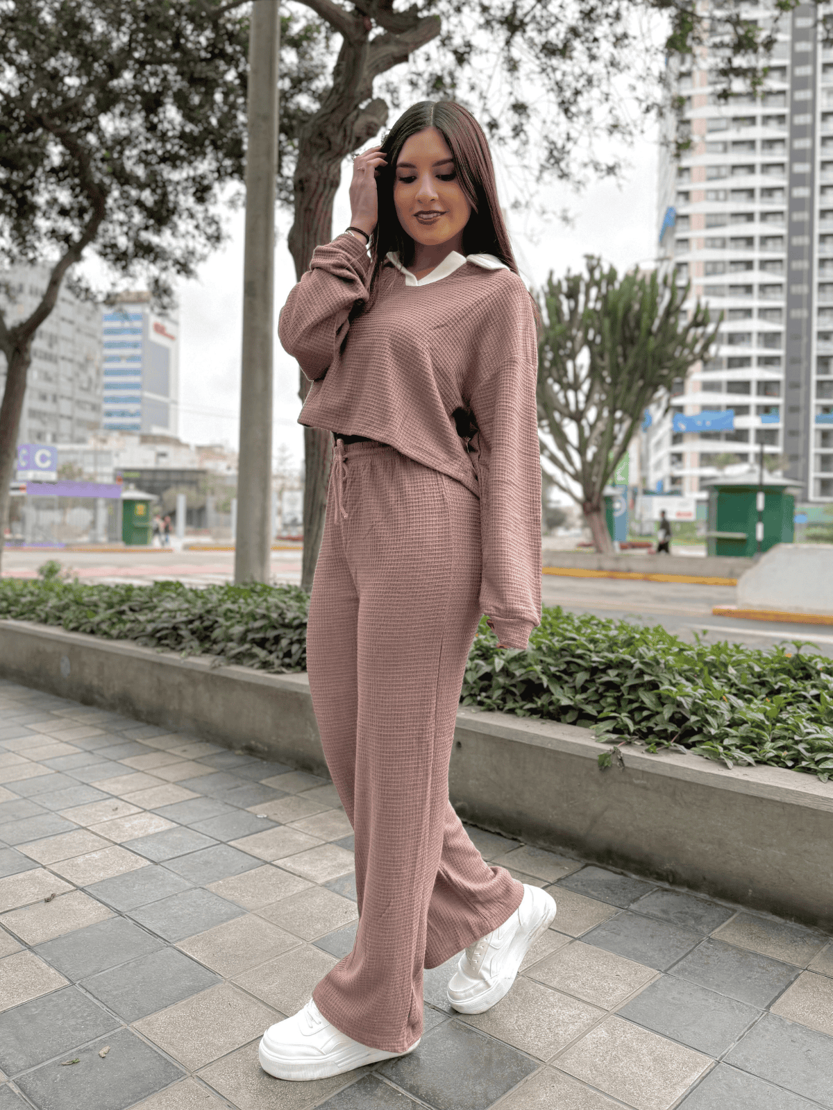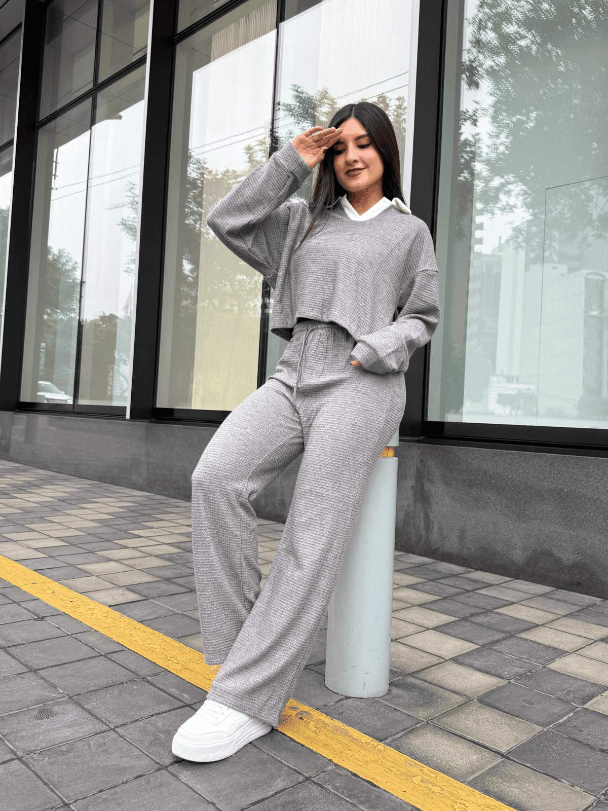 Conjunto en material wafer, ligero y cómodo, ideal para el día a día. El polo crop con cuello camisero le da un aire moderno y sofisticado, mientras que el pantalón recto aporta frescura y estilo. Una opción versátil para armar looks casuales con un toque elegante.