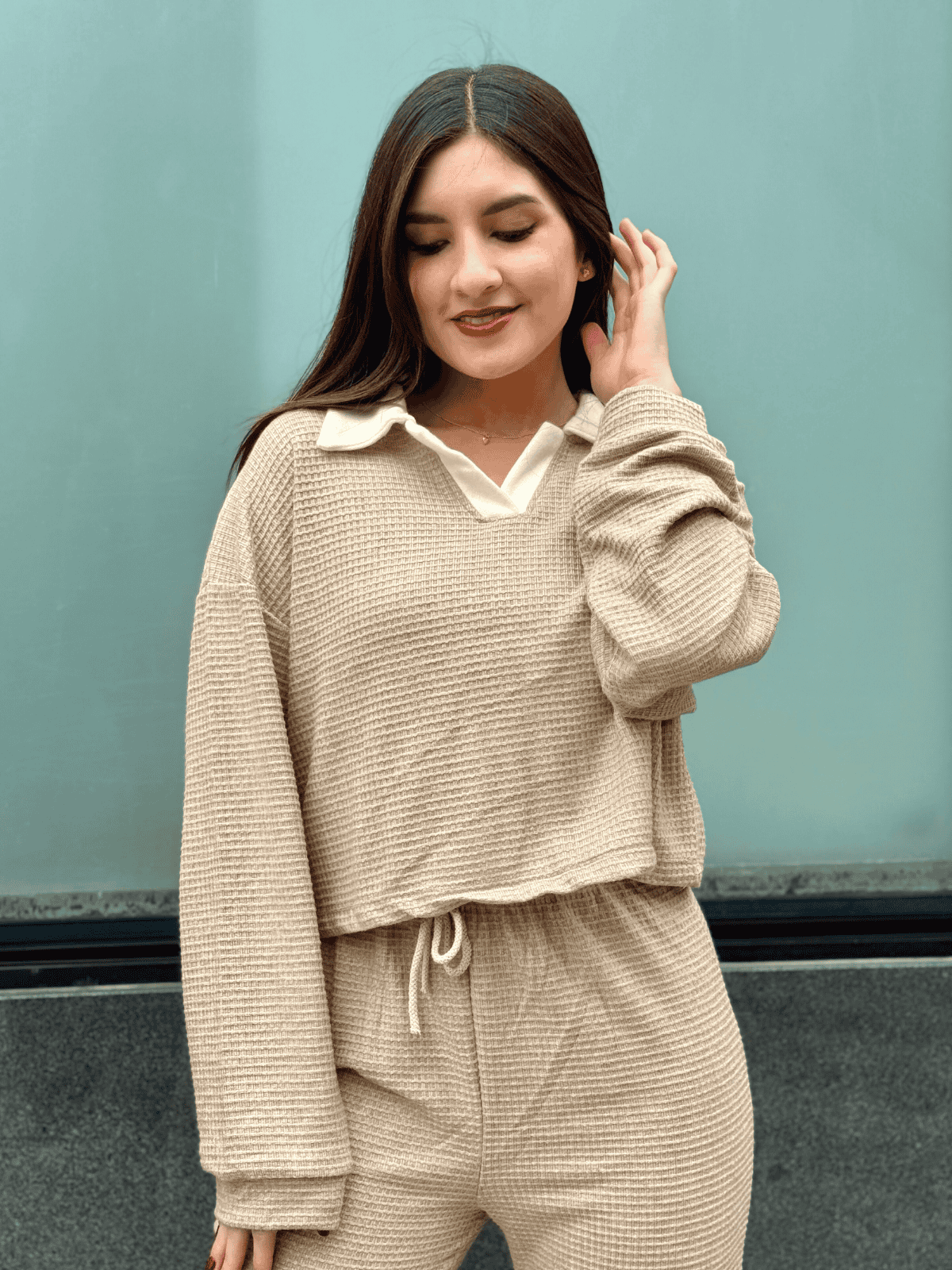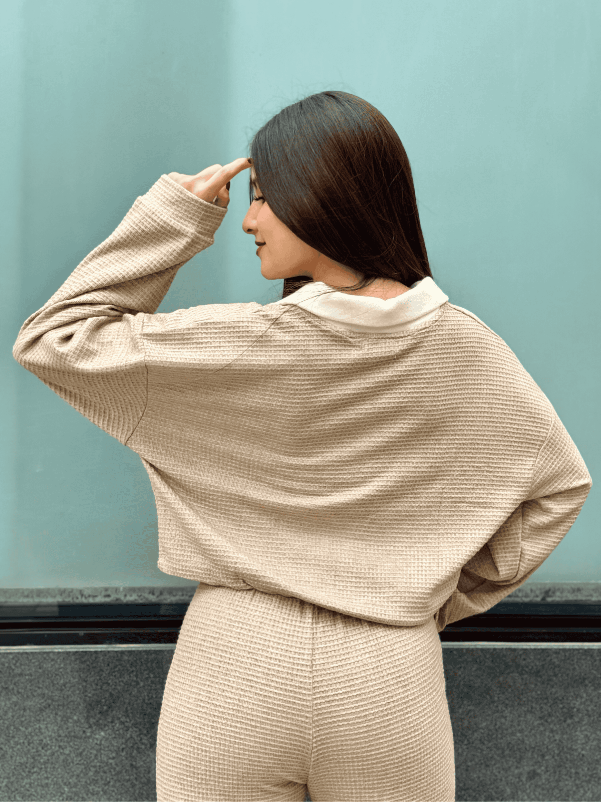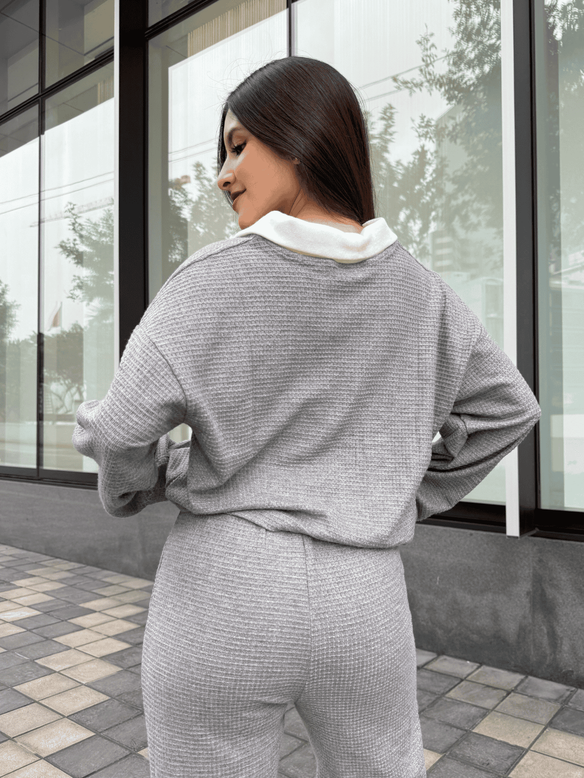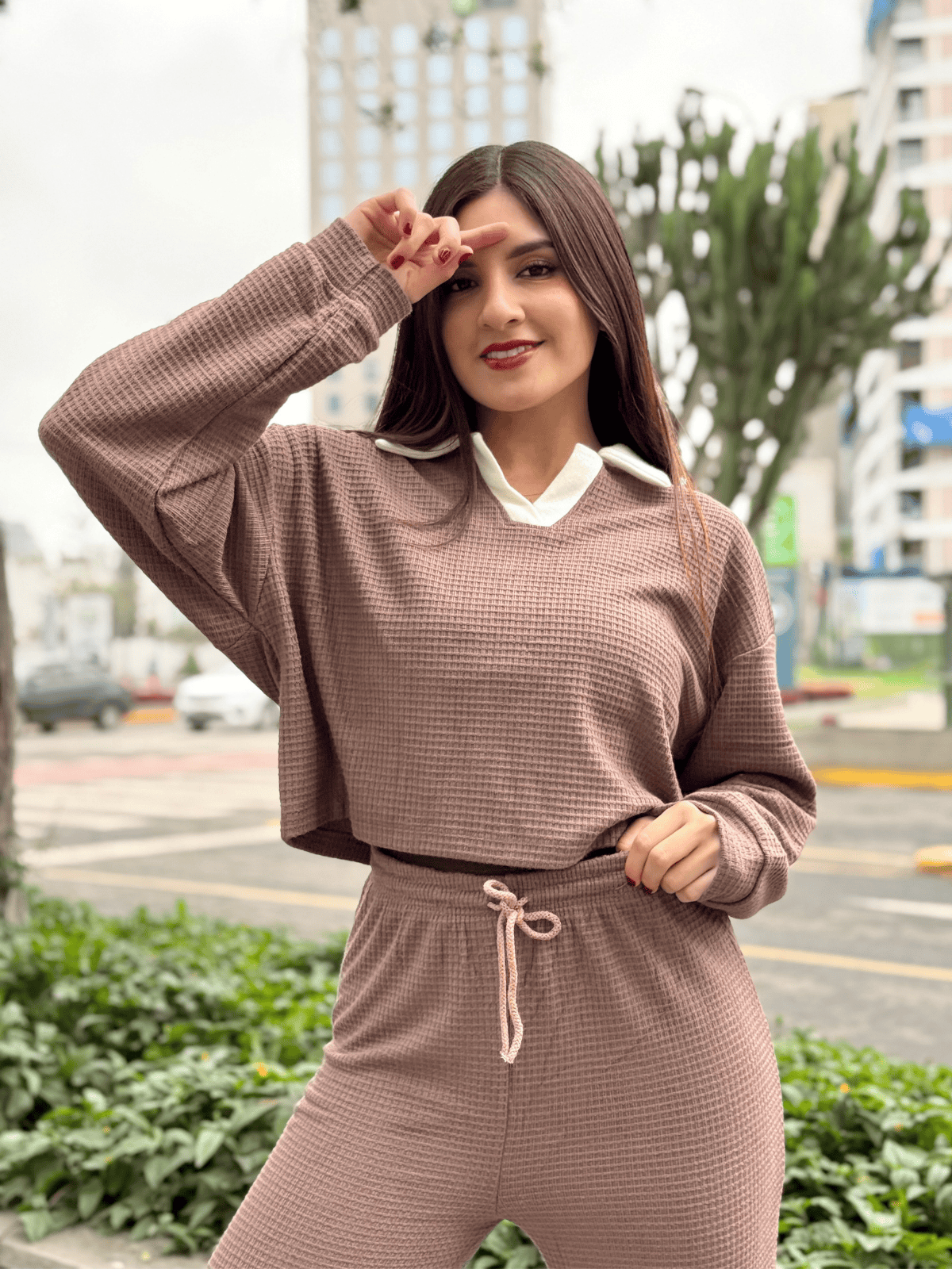 Conjunto en material wafer, ligero y cómodo, ideal para el día a día. El polo crop con cuello camisero le da un aire moderno y sofisticado, mientras que el pantalón recto aporta frescura y estilo. Una opción versátil para armar looks casuales con un toque elegante.